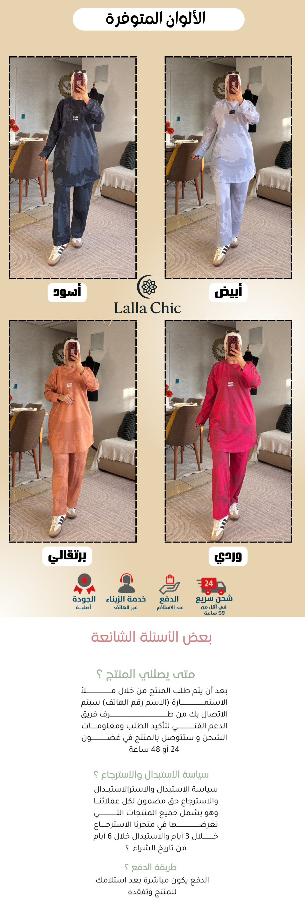اكتشفي اللوك المثالي الراقي من لالاتشيك، مصنوع من قماش مريح وخفيف وبتصميم أنيق يناسب جميع الإطلالات. طقم عملي، أنيق، وكيعطيك راحة لا مثيل لها طوال اليوم.